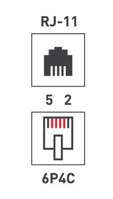 Оснащена двумя параллельно расположенными гнездами. Каждое гнездо имеет 6 пинов 4 из которых заняты медными контактами (2 контакта используются под питание, 2 – под телефонную линию).