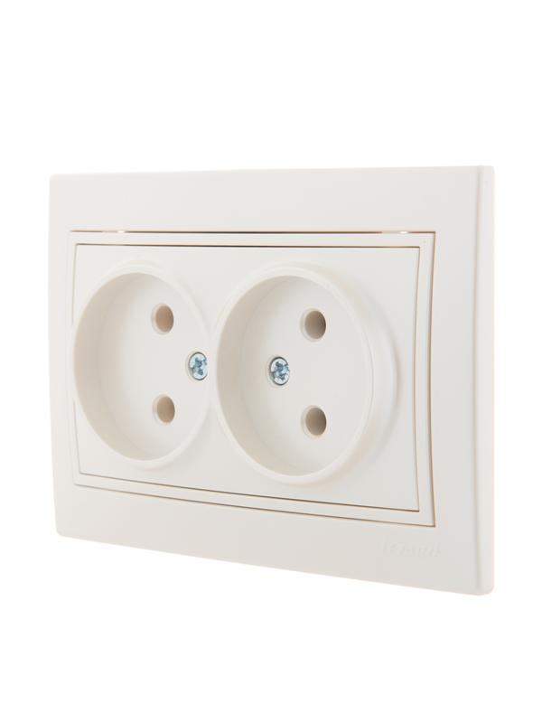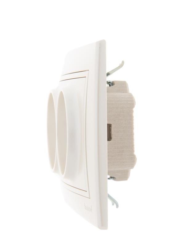 Корпус представляет собой форму из негорючего пластика, белого цвета, с защитными шторками, автоматически закрывающими гнезда розетки при вынутой вилке. Основание керамическое. Подпружиненные лапки крепления обеспечивают комфортный и легкий монтаж изделия. Предусмотрена возможность установки без применения монтажной коробки.