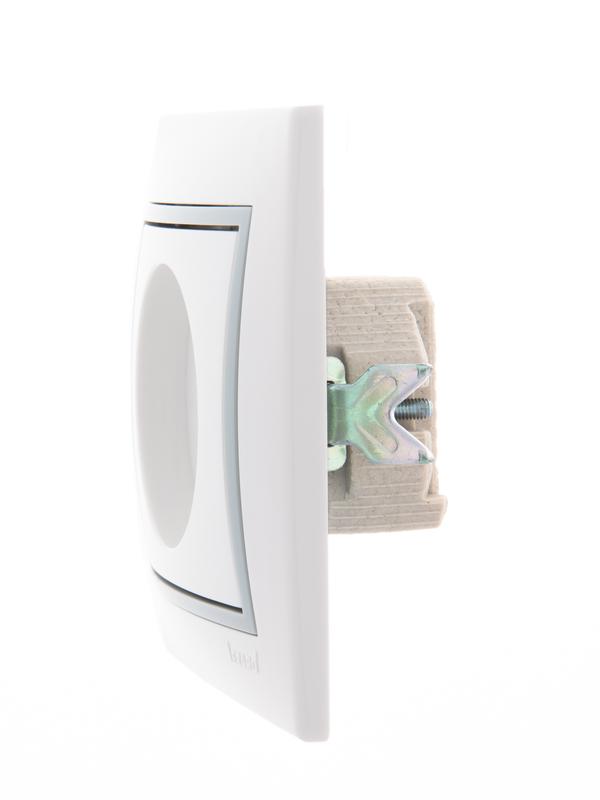 Корпус представляет собой форму из негорючего пластика, шириной 90 мм, с основой белого цвета и декоративной рамкой цвета блестящий металлик. Основание керамическое. Подпружиненные лапки крепления обеспечивают комфортный и легкий монтаж изделия. Предусмотрена возможность установки без применения монтажной коробки.