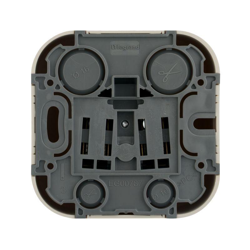 Изготовлен из пластика, квадратной формы, со стороной, равной 65 мм, цвета слоновой кости. Монтируется на глубину 38,5 мм, на поверхность стены.