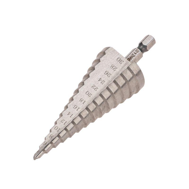 На каждой из 14 ступеней сверла нанесена маркировка фактического диаметра. Диапазон ступеней: 4, 6, 8, 10, 12, 14, 16, 18, 20, 22, 24, 26, 28, 30 (шаг 2 мм).