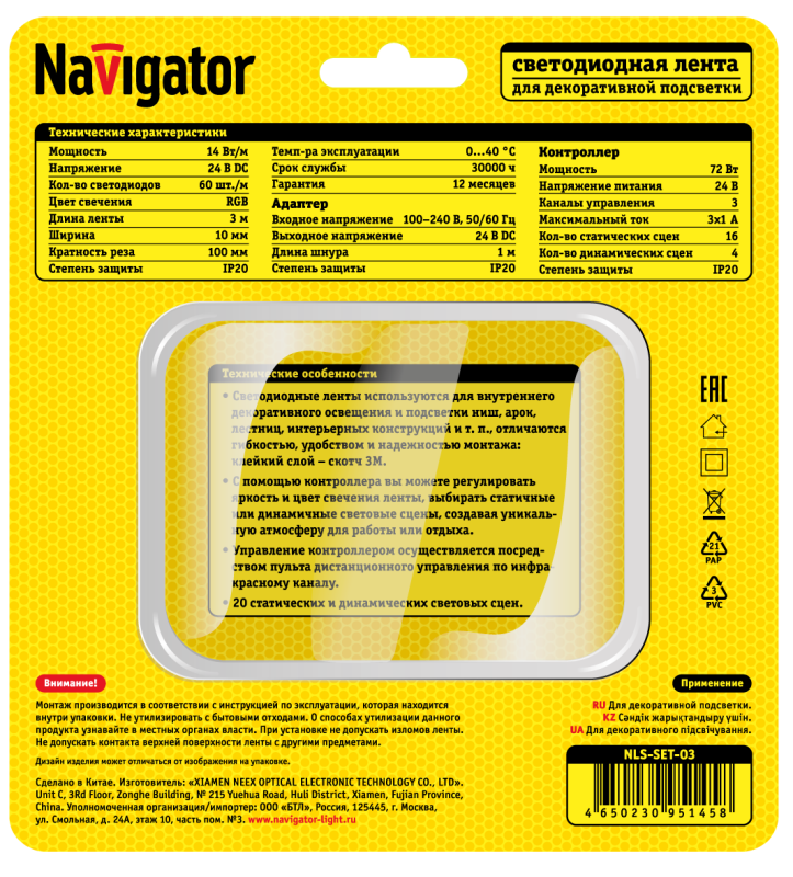 • В комплекте: светодиодная лента, адаптер, IR-контроллер с пультом ДУ и монтажный набор