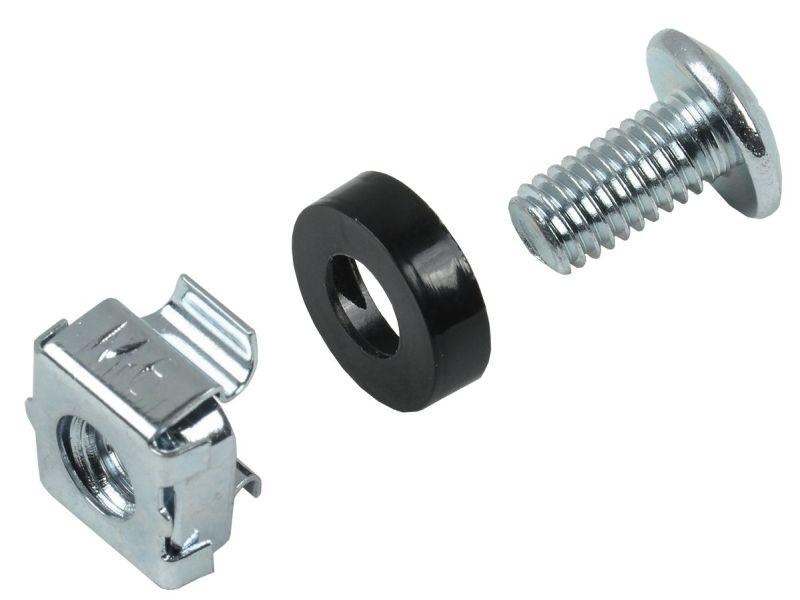 Гайки в наборе имеют квадратную форму и специальные "лапки", прочно фиксирующие их в квадратном отверстии монтажных профилей, что облегчает установку оборудования, т.к. нет необходимости держать гайку руками. Также в наборе предусмотрены пластиковые шайбы, предотвращающие повреждение оборудования при затягивании винтов в гайку.